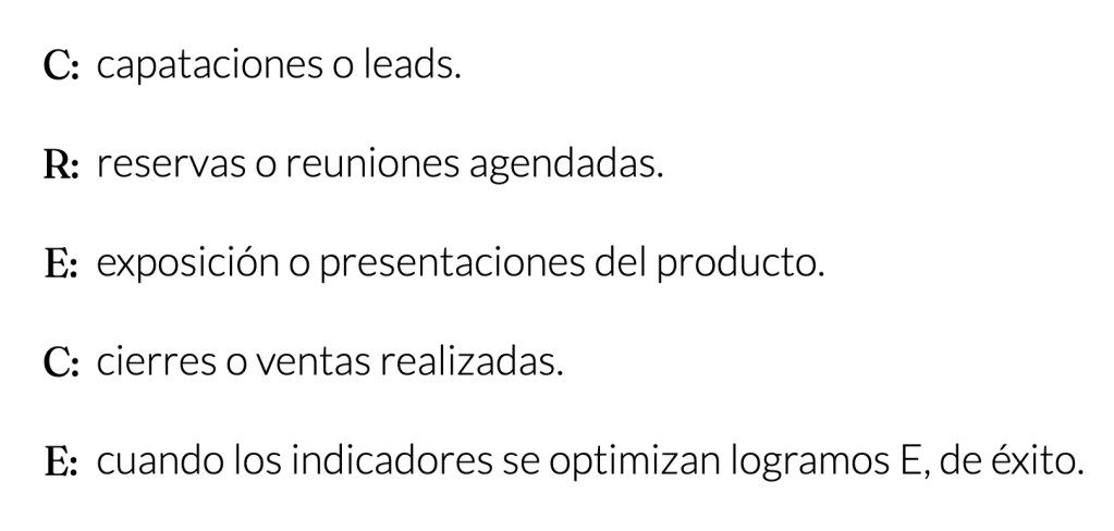 Llamo a la metodología CRECE y consiste en medir cada semana o 15 días los siguientes indicadores: